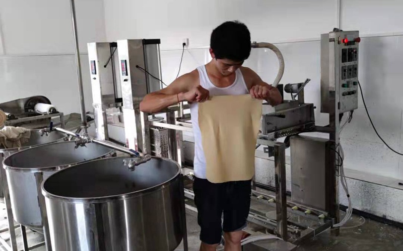 以复式折叠豆腐皮生产线为例,该设备在折叠精度与成型效果方面表现出色,可大幅减少人工操作环节,降低劳动成本。同时,大型全自动豆腐皮生产线整合了磨浆、煮浆、泼皮、脱布、烘干等多道工序,真正实现了从大豆到成品豆腐皮的一体化加工。